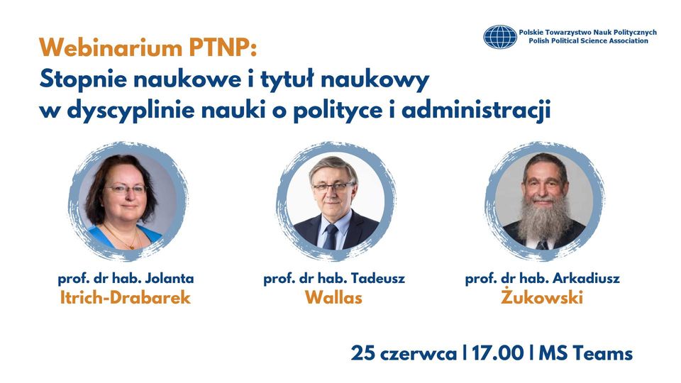 Zapraszamy na kolejne webinarium. Tym razem będziemy rozmawiać o awansach naukowych z przedstawicielami naszej dyscypliny w Radzie Doskonałości Naukowej: prof. Jolantą Itrich-Drabarek, prof. Tadeuszem Wallasem i prod. Arkadiuszem Żukowskim. Zapisy do 23 czerwca pod linkiem https://forms.office.com/e/v1TwDagWkg