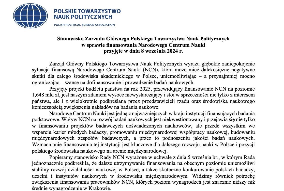 Zarząd Główny przyjął stanowisko w sprawie problemów z finansowaniem Narodowego Centrum Nauki. „…wyrażamy głębokie zaniepokojenie sytuacją finansową Narodowego Centrum Nauki (NCN), która może mieć dalekosiężne negatywne skutki dla całego środowiska akademickiego w Polsce, uniemożliwiając – a przynajmniej mocno ograniczając – szanse na dofinansowanie i prowadzenie badań naukowych (…) Dlatego apelujemy do Rady Ministrów o zwiększanie …