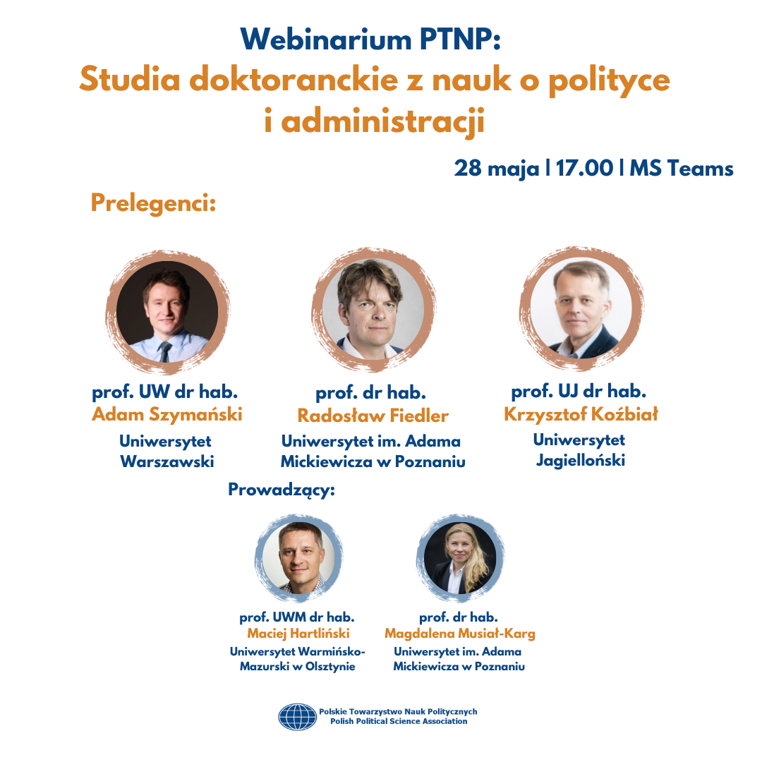 28 maja o godz. 17.00 odbędzie się kolejne webinarium PTNP. Tym razem spotkanie poświęcone będzie studiom doktoranckim z nauk o polityce i administracji. Prelegenci: prof. Radosław Fiedler, prof. Krzysztof Koźbiał (UJ) i prof. Adam Szymański (UW) Formularz zgłoszeniowy: https://forms.office.com/e/NJURrGpQy8 Czas: 90 min. Link do spotkania będzie wysłany do zarejestrowanych osób w dniu 27 maja
